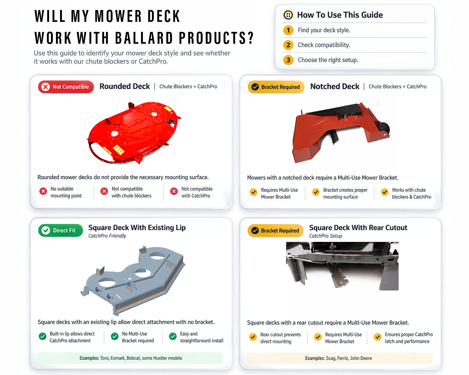 Not compatible with rounded chute openings — the deck opening must be squared off for proper fit and function. Some notched decks can be compatible with our multi fit bracket system. Please use the search by mower feature and reach out if you are unsure.